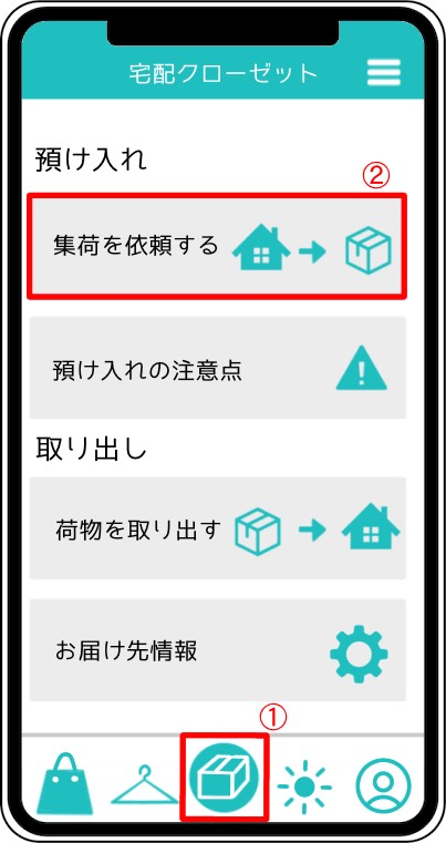 衣服の預け入れ方法 2024.01.092023.12.13 操作方法 1.箱のアイコンをタップ 2.預け入れから「集荷の依頼をする」をタップ 3.箱数と集荷希望日を選択し、「確定する」をタップ ※集荷住所はマイページの登録情報か、お届け先情報からも変更頂けます。 ご利用方法へ戻る